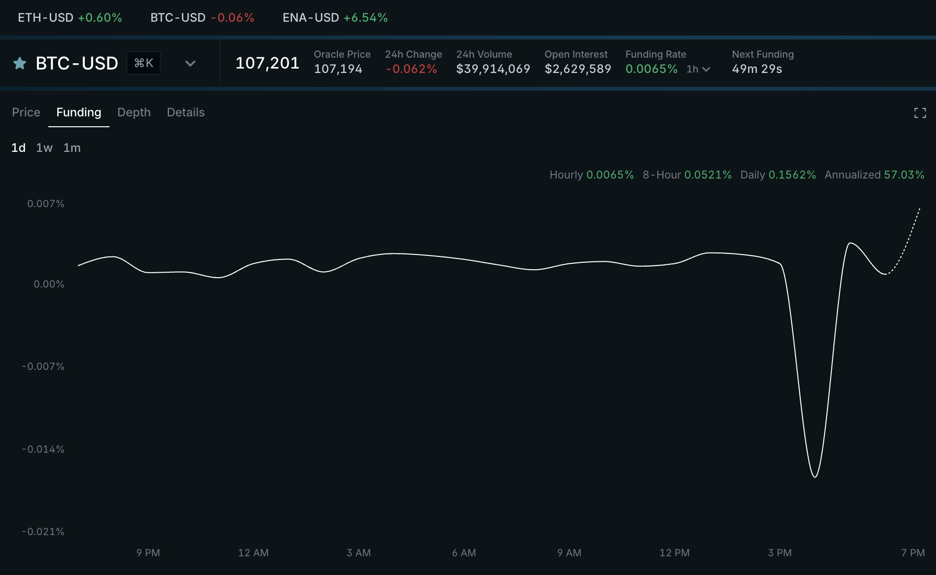 Perpetual markets use hourly funding to keep prices aligned with spot. When funding is positive, longs pay shorts; when negative, shorts pay longs. Payments occur every hour on the hour, with rates calculated based on the premium or discount to the index price. Current funding rates are displayed at the top of each market in hourly, daily, and annualized formats, alongside a dedicated chart displaying the historical funding rates.
