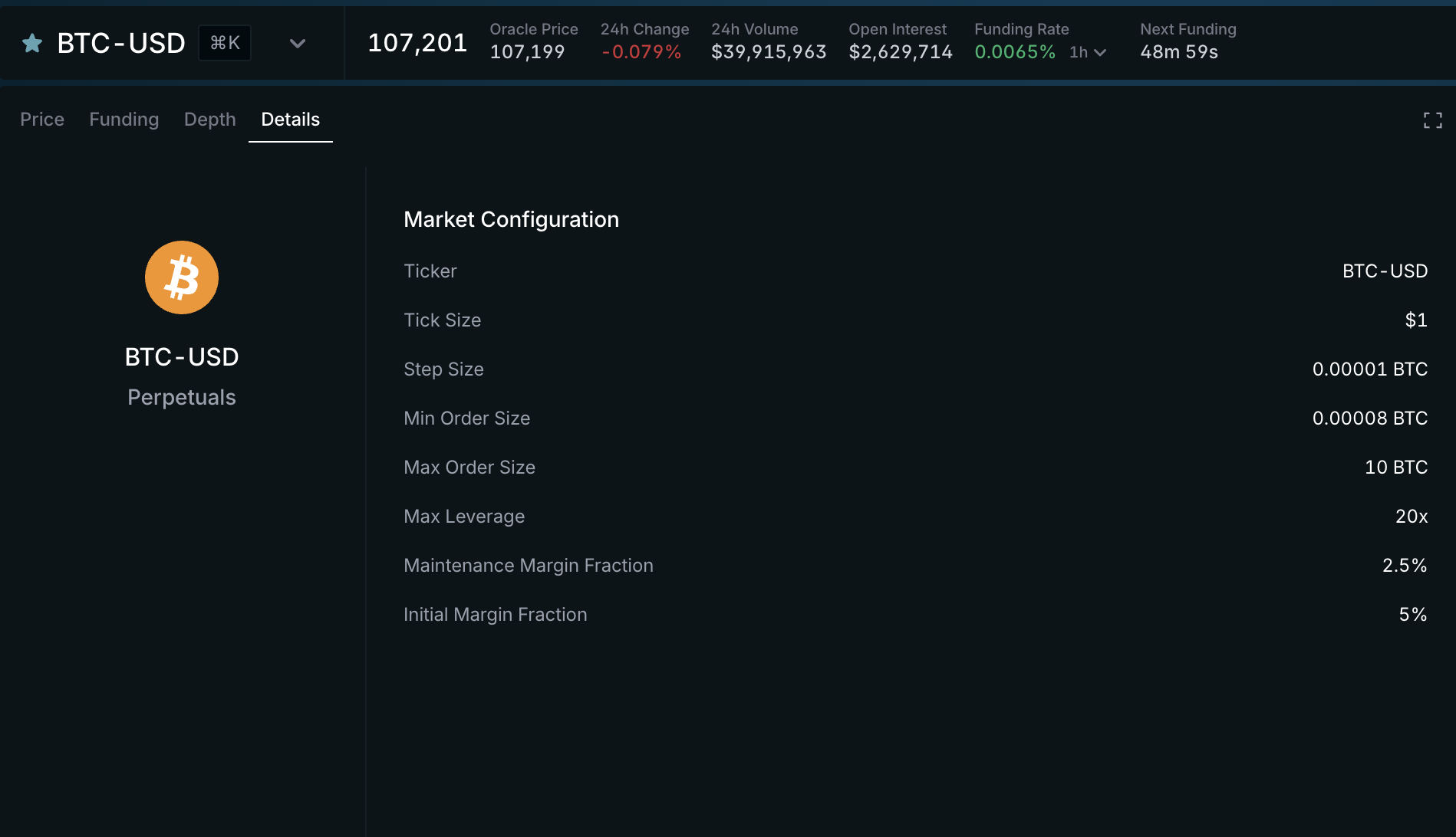 For complete specs on any market, including step size, order limits, margin fractions, etc, see the details panel for any market.